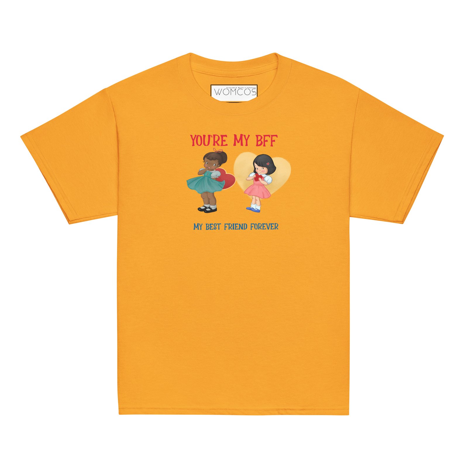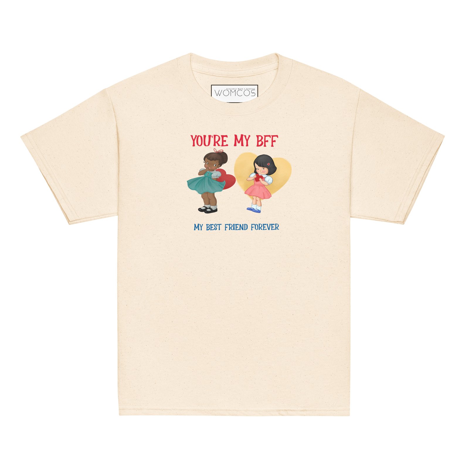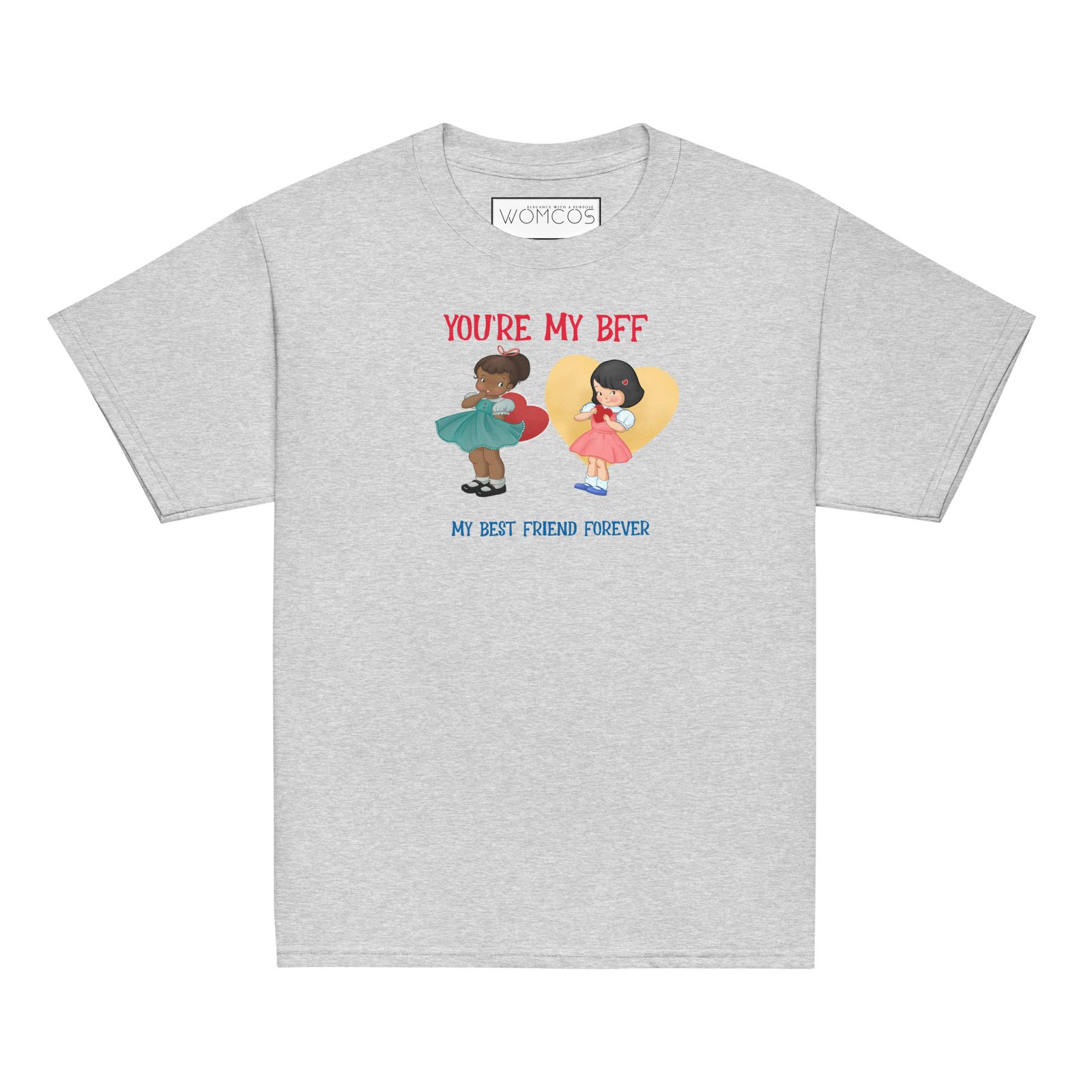 Celebrate the magic of friendship with this cheerful “You're My BFF” t-shirt! Featuring two sweet best friends with colorful hearts and dresses, this design is a perfect reminder of love, fun, and forever bonds.You’re My BFF – Youth Classic Friendship Tee